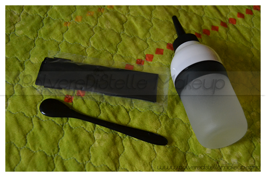 Ovviamente troviamo un paio di guanti monouso ( e qui spezzo una lancia in quianto i guantini delle tinte solitamente sono scrausissimi, mentre questi sono comodi e belli robusti!),una spatolina per mescolare nell’applicatore la crema colorata e il rivelatore, e ovviamente il flacone applicatore.