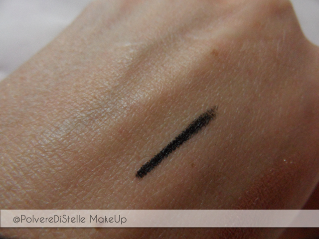 La foto che vedete sopra invece riguarda lo swatch della matita eyeliner,un bel nero intenso e particolarmente duraturo dal momento che ho impiegato non so quanto ad eliminare lo swatch dalla mano.Anche in questo caso,non ho ancora avuto modo di provarla ma ve la recensiro’ quanto prima.