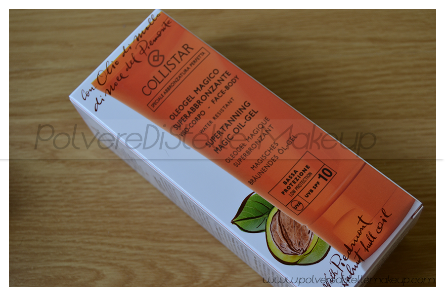 Si tratta di un solare innovativo che protegge la pelle e le consente di ottenere in breve tempo un colore intenso, luminoso e a lunga durata,difficile da ottenere con i solari classici. Esso é caratterizzato da una texture “ultra-sensoriale”, com’e’ definita sul sito ufficiale, che abbina la leggerezza di un gel alla ricchezza di un olio. Esso si fonde perfettamente sulla pelle,assorbendosi con facilita’, senza ungerla mantenendola morbidissima e levigata, anche dopo molte ore di esposizione solare. Accelera e intensifica l’abbronzatura grazie all’Unipertan® e agli oli di carota e di mallo di noce del Piemonte. Ricco di princìpi attivi e vitamine, assicura una mirata azione idratante, elasticizzante e anti-età.Contiene SPF 10 quindi adatto a chi ha un fototipo 3 o 4 o a chi ha gia’ acquistato un bel colorito e ha superato la delicata fase eritematosa delle prime esposizioni. E’ resistente all’acqua. Il prezzo é di 26.70 euro per 150ml di prodotto.