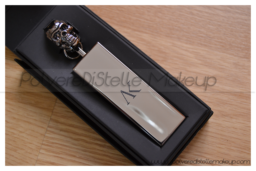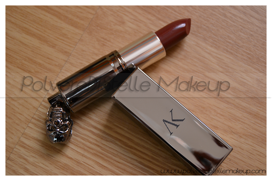 Partiamo dal packaging del rossetto, che credo sia la cosa che colpisce maggiormente, perlomeno a colpo d’occhio. Un pack in metallo minimal ma estremamente elegante. Lo stick é racchiuso all’interno del pack ed é estraibile attraverso un charm a forma di teschio posto su di un’estremita’. Un oggetto assolutamente goth che lascia trasparire l’essenza estremamente particolare del prodotto.
