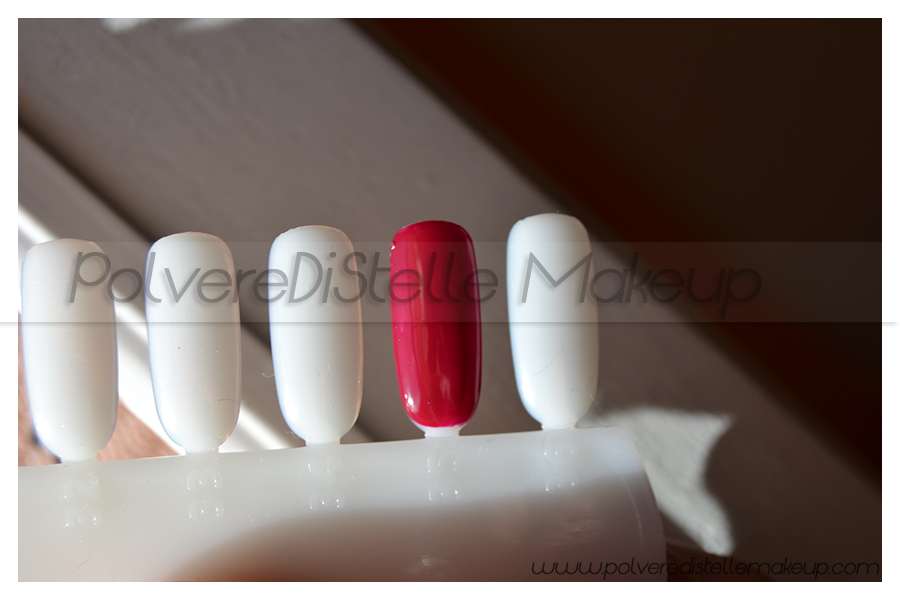 Ripresi anche in questo caso in situazioni luminose differenti, possiamo comunque vedere la particolarita’ di questo punto di rosso, assolutamente elegante pur non essendo classico come un convenzionale rosso caldo. Il prezzo dello smalto é di 9.50 euro.