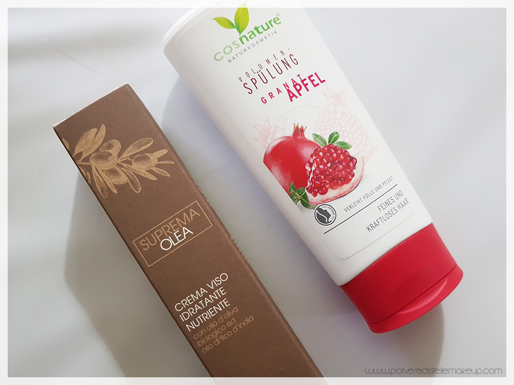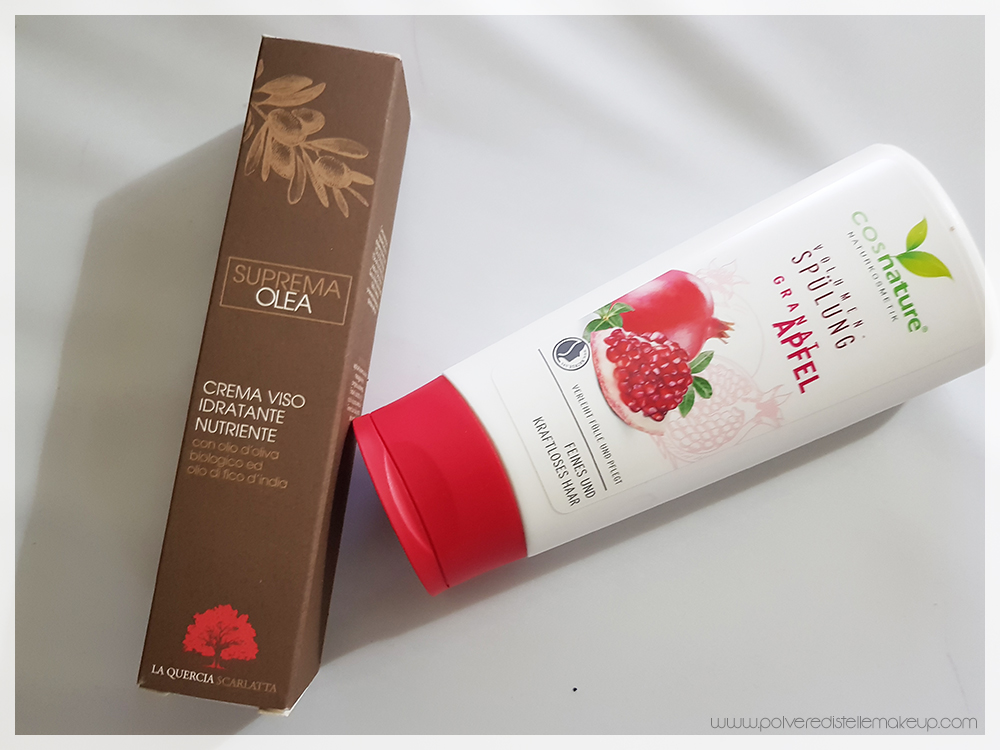 Ho avuto così l’opportunità di ricevere una Crema Viso  Idratante Nutriente Suprema Olea e uno Shampoo Cosnature al Melograno per capelli grassi, sottili o che tendono a sporcarsi facilmente.