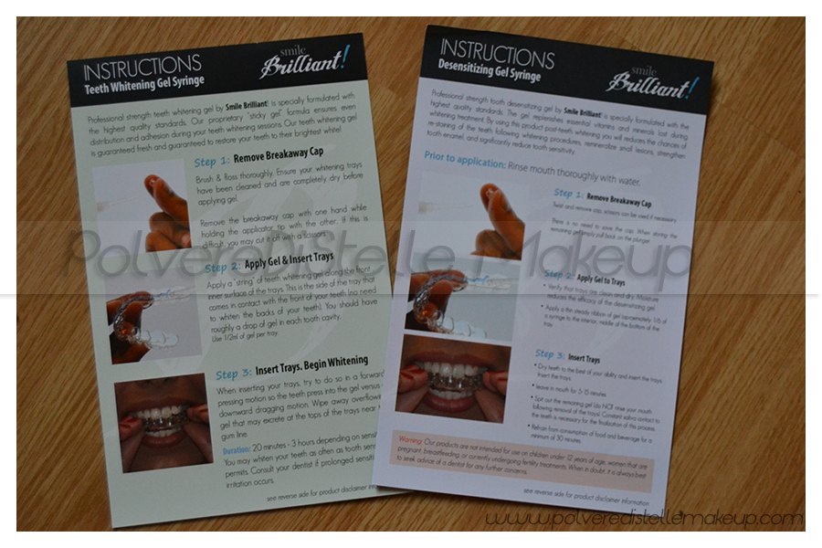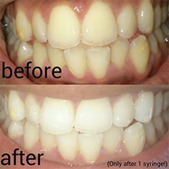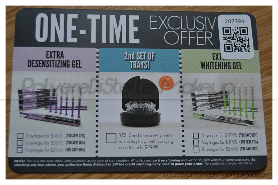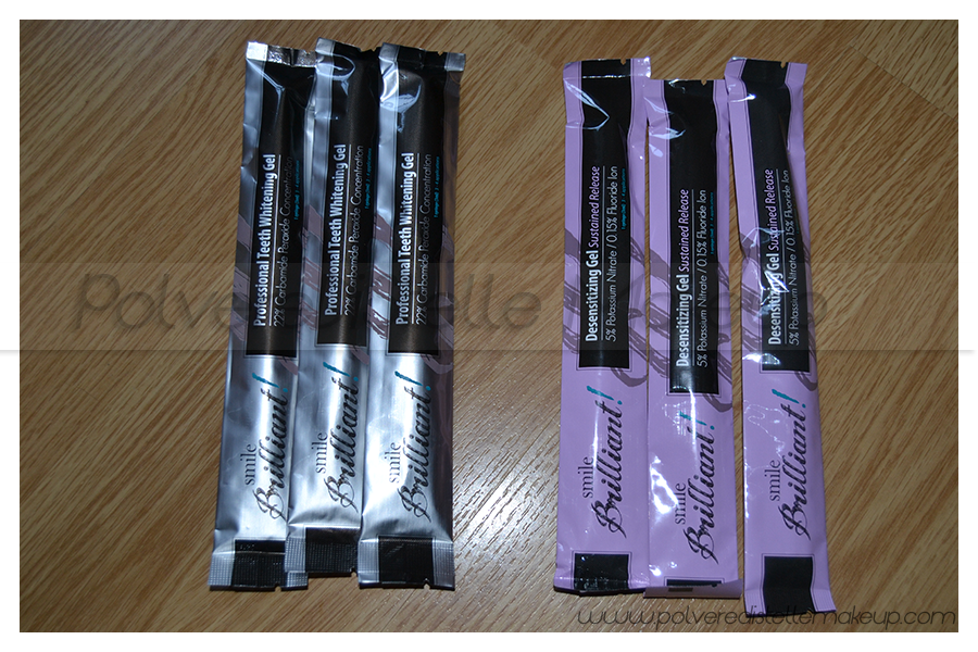 Nel kit troviamo poi tre siringe di gel desensibilizzante da utilizzare dopo ogni sbiancamento per almeno 15 / 20 minuti che va ad eliminare il fastidio dato dall’eventuale sensibilizzazione provocata dallo sbiancamento.
