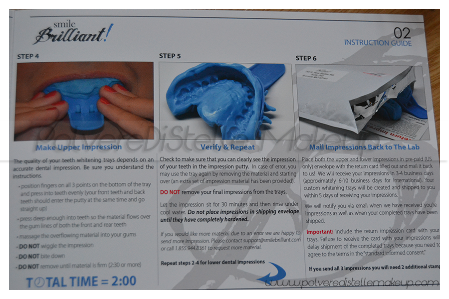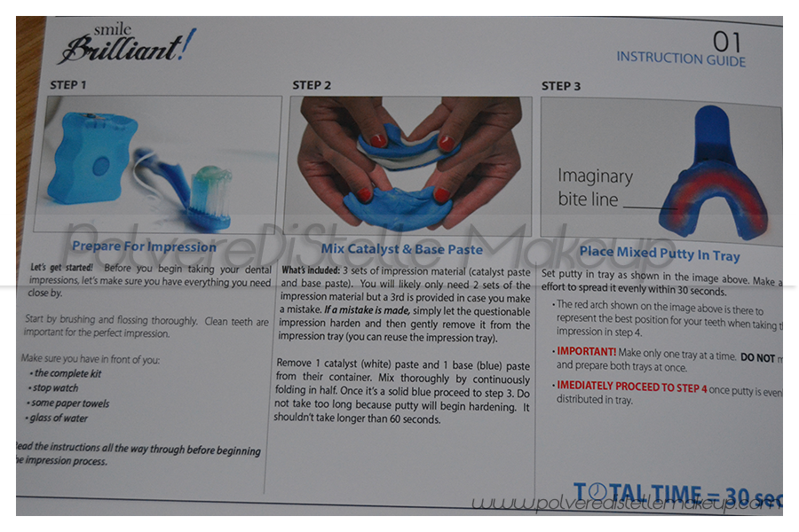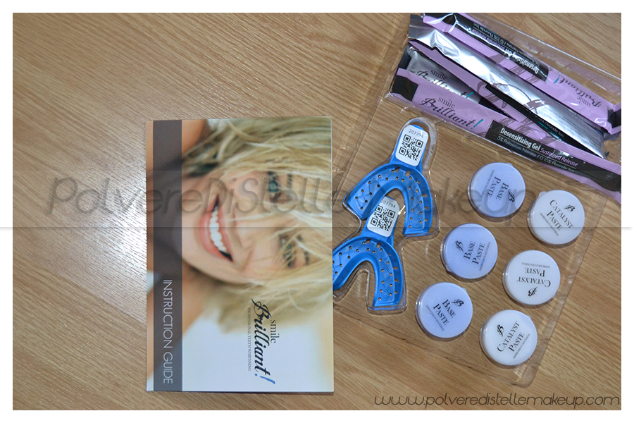 Saltano subito all’occhio le due mascherine azzurre e i sei barattoli che vedete nella foto: Tre di pasta base e tre di pasta catalizzante. Qui viene il bello (nonche’ il motivo per cui’ non posso provare subito il kit!), infatti Smile Brilliant si differenza dai comuni trattamenti sbiancanti in quanto é totalmente personalizzato. Siamo abituati a vedere quelle classiche mascherine standard che non sempre sono adatte alle nostre arcate e che quindi non ci consentono di effettuare un trattamento veramente efficace su tutti i denti. Ebbene, troviamo tutto il materiale occorrente per creare le nostre impronte esattamente come dal dentista, che dovremmo rispedire (nel mio caso mi verranno rimborsate le spese di sped. non so ancora se in denaro su Paypal o in prodotti per lo sbiancamento),