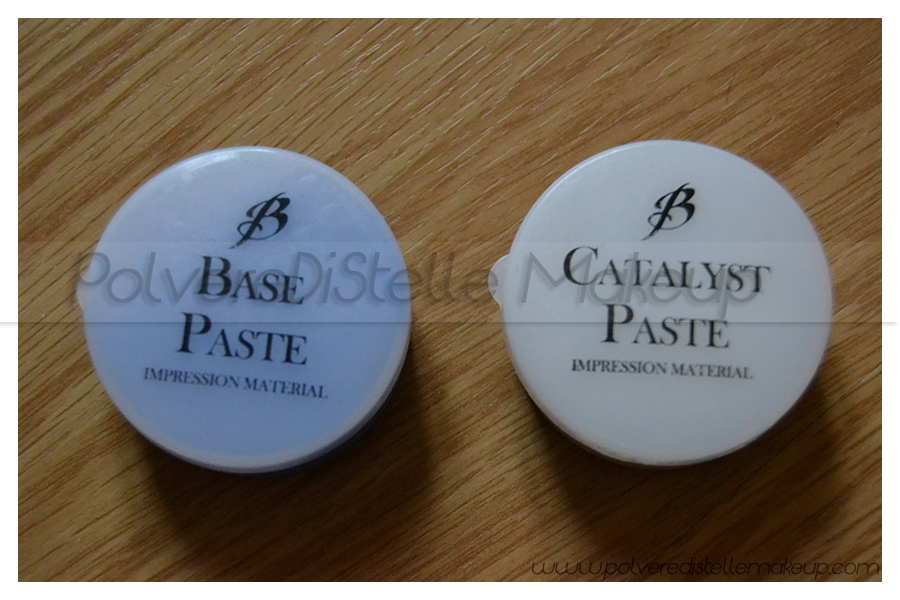 Recapitolando: misceliamo le due paste insieme un po’ come se fossero “pongo”, dopodiche’, quando la pasta é di colore azzurro uniforme, provvediamo a sistemarla sulla mascherina. (i due barattolini sono necessari per ciascuna impronta. Nella confezione trovate anche la quantita’ necessaria a ricoprire anche un eventuale tentativo extra qualora l’impronta non ci soddisfasse).