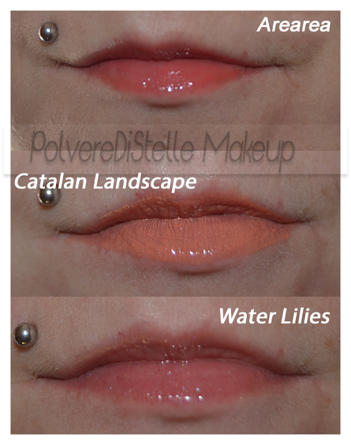 Non sono un’amante dei gloss, in quanto preferisco i rossetti a lunga tenuta sia per quanto riguarda la resa che il finish (non mi piacciono i prodotti appiccicosi per intenderci!), tuttavia la formulazione dei Vernissage Natural Gloss non mi dispiace per nulla: pur trattandosi di gloss (quindi non stiamo parlando di rossetti liquidi o long lasting), possiedono una texture molto piu’ consistente e corposa, che aderisce perfettamente alle labbra e si rivelano piuttosto coprenti: nel mio caso il piu’ coprente é senza dubbio Catalan Landscape, anche se il colore dato il mio sottotono su di me stona un po’!), segue a ruota Arearea e infinite Water Lilies che nasce volutamente per essere trasparente e piuttosto cangiante, perfetto per essere abbinato ad un rossetto utilizzato come base!