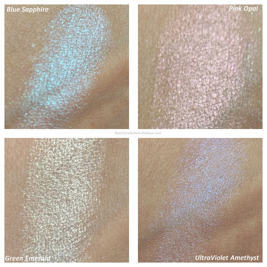 (Da notare che per uno strano errore probabilmente di produzione, nella mia palette sono state invertite le posizioni di Ultra-Violet Amethyst e di Green Emerald che nel frattempo ho opportunamente scollato e riposizionato al posto giusto. Sappiate che nelle foto successive continuerete a vedere gli ombretti cosi, ma che in realtà, L’ombretto centrale è posto in alto alla vostra sinistra e viceversa!!!).