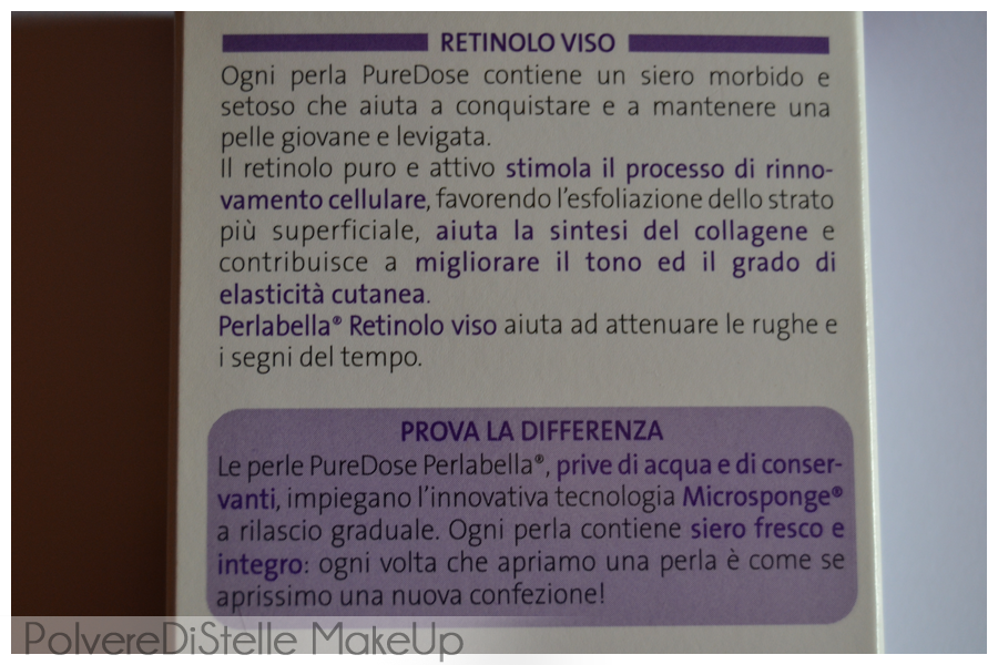 Quello che ho avuto modo di testare io,si chiama “Perlabella” – Retinolo viso,e sempre della linea,sono reperibili svariate tipologie di prodotto,dalla Vitamina C,per il viso,all’Acido Ialuronico,tutti atti al ringiovanimento della pelle,e alla prevenzione di rughe ed inestetismi cutanei dati essenzialmente dall’eta’.
